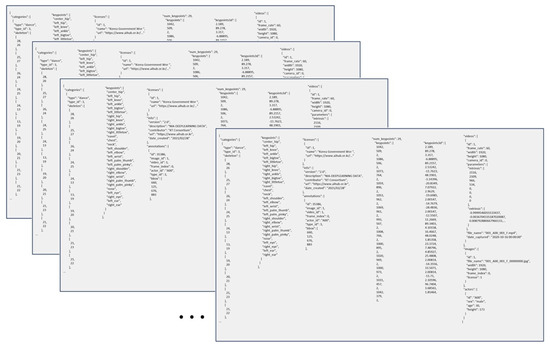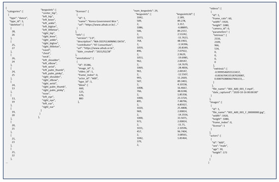 Figure 16 shows a description of a posture stored in a script file. This description includes information on a posture, such as the category, 29 key points, licenses, coordinates of key points, 3D, videos, the name of an image file, images, and actors. This paper limited the maximum number of postures to be generated to 100 and thus included 100 script files (*.json).