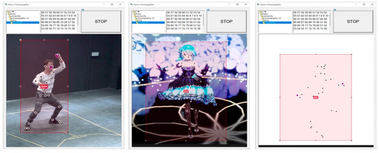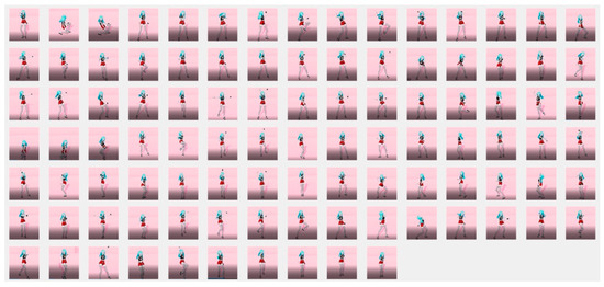 The proposed system generated a posture by using an image obtained from a dance video and 29 key points and represented creative choreography based on an arrangement of postures that belonged to gestures that it learned. Postures including key points were displayed in three types. The first type shows the posture of an AI HUB’s dancing character, including key points. The second type shows a posture of a 3D animation character designed in this paper. The third type shows an image of the skeleton extracted from the AI HUB’s dancing character or 3D animation character designed in this paper. Based on the entered choreography as the correct answer, the choreography is created by recombining the generated gestures. Change the existing choreography by learning the relationship between posture and posture in the posture group that composes the gesture. The evaluation criterion is the probability of creating a new choreography creatively through the input choreography, but at the same time, learning the connection between poses and making the next move. The three cases created through this process are shown in Figure 37.