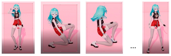 Dance videos uploaded online can be used as source videos in this paper. However, this paper limitedly used dance videos of a dancing character provided on AI HUB, an integrated AI platform, and dance videos of 3D animation characters, which were designed in this paper, because of copyright issues. In this paper, two types of experiments were carried out. To generate a posture, the proposed system generated an image file of a character and a script file where 29 key points were established in a bbox to represent the skeleton of the character. Figure 14a shows an image file of a character and a script file containing the skeleton of the character. Figure 14b shows the process of generating a posture by using an image file of a 3D animation character and a script file.