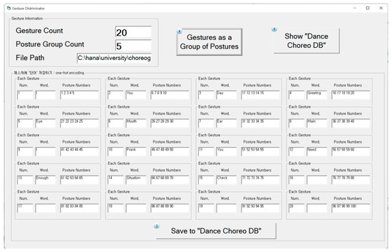 As shown in Figure 26, the gesture discriminator transferred information to the Dance-Choreo-DB, which stores the transferred information, or outputs it. The output data was based on the form of [a gesture number, a gesture word, multiple posture numbers]. The output data was formed based on the K-POP dance video for Everglow’s song Adios used in this paper.