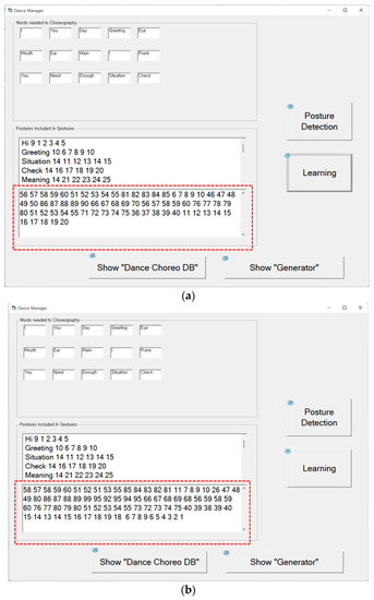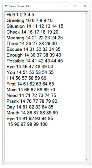 The Dance-Choreo-DB stores gestures that contain designated gesture words and those which do not contain designated gesture words. This DB stores gestures without words designated by the gesture discriminator, as shown in Figure 28a, and those with words designated by the user, as shown in Figure 28b.