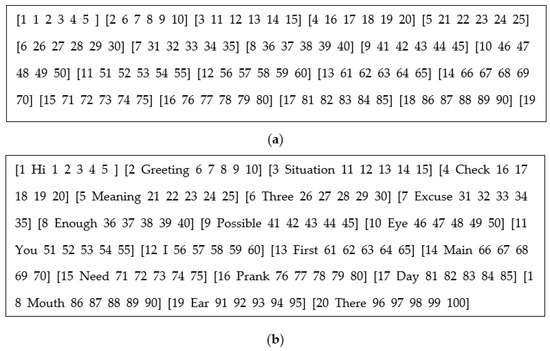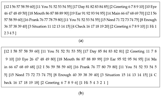 The word controller extracts words from words input by the user by classifying words based on spacing. Figure 29 shows elements of the word controller. Extracted words are designated as gestures. The word controller extracted lyrics from the K-POP song and detected, and designated functions for gestures and random words input by the user were applied. Based on the applied data, gestures stored in the Dance-Choreo-DB were detected. Figure 29a shows the processes where the word controller extracted lyrics and where the user stored words. As for input data, the word controller extracted the following 20 words from the lyrics of the K-POP song Adios released by Everglow: Hi, Greeting, Situation, Check, Meaning, Three, Excuse, Enough, Possible, Eye, You, I, First, Main, Need, Prank, Day, Mouth, Ear, and There. Figure 29b shows a process where the user inputs random words for a creative purpose on the word controller. For example, the user formed a new word arrangement by combining previously-stored words as follows: [I You Day Greeting Eye Mouth Ear Main I Prank You Need Enough Situation Check Greeting Hi].