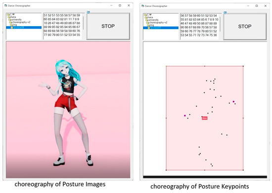 The dance choreographer received creative choreography generated after the learning process from the dance manager. Then, it arranged posture numbers that belonged to the gesture word, which was learned by the proposed system, and which matched the combination of words input by the user. Finally, it displayed postures images, which corresponded to the detected posture numbers, at the interval of a second. Figure 32 shows images of the creative choreography result derived from the proposed system. The first image is a posture image detected from the dance video of an AI HUB’s dancing character or that of an animation character designed in this paper. The second image shows 29 key points that represent the body of a dancing character on AI HUB or an animated character designed in this paper.