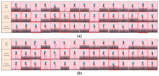 Dance choreography screenshot, they should be listed as: (a) before Bi-LSTM learning; (b) learning through Bi-LSTM for difficulty level of posture, preference, and level of dance.