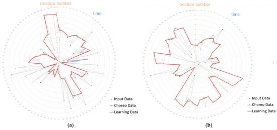 The dance manager transferred creative choreography generated before the learning process and after the learning process to the dance choreographer. Figure 31a shows a type of gesture data stored before the learning process, and Figure 31b shows a type of gesture data stored after the learning process.