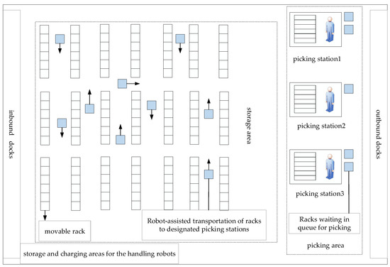 In recent years, the proliferation of internet users and the growth of e-commerce platforms have made online shopping a significant mode of consumption. In 2021, the number of online shoppers in China was estimated at 842 million. The substantial increase in users presents a challenge for e-commerce warehouses, which must process an increasing volume of orders. The efficient processing of orders and the completion of picking activities have thus become a pressing issue for companies operating in this domain [1]. Order picking refers to extracting products from storage locations in a warehouse to fulfill customer orders [2]. The traditional “picker-to-parts” picking system entails workers continuously visiting racks, incurs non-productive costs and labor expenses, and is ill-equipped to meet the growing demand for order fulfillment [3]. With the advancement of Internet of Things technology and intelligent devices, the “parts-to-picker” order picking system has emerged to address these challenges, which becomes a crucial means for e-commerce warehouses to enhance order picking efficiency [4,5].