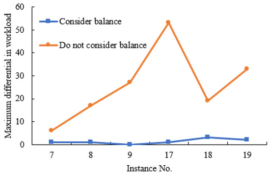 Table 7 compares six randomly selected cases from the set of instances to demonstrate the importance of workload balancing. The cases compare the picking station workload with and without considering the workload balancing objective to obtain the minimum rack moving distance. For the 6 cases, the solutions obtained by considering the workload balancing objective showed an average decrease of 92.27% in the imbalance of the picking station workload compared to the solutions obtained without considering this objective, with reductions of 83.3%, 94.1%, 100%, 98.1%, 84.2%, and 93.9%, respectively. On the other hand, the obtained rack moving distance increased by an average of 6.35%, with increases of 3.4%, 1.7%, 3.0%, 8%, 19.5%, and 2.5%, respectively. Figure 4 and Figure 5 compare the maximum workload difference and rack moving distance, respectively, between considering and not considering the balancing.