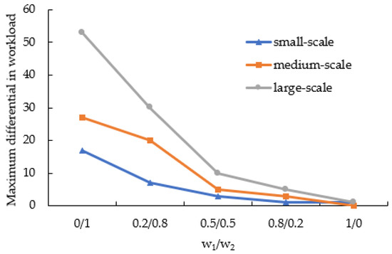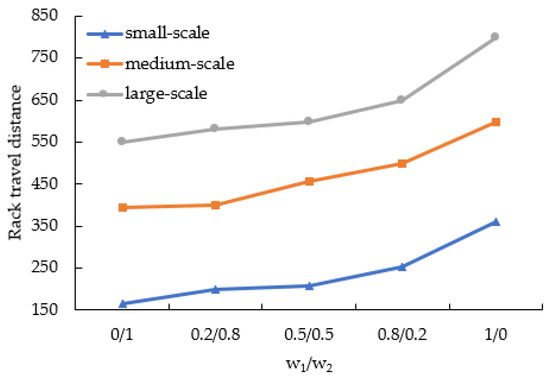 Due to the direct impact of weighting coefficients and on the solution of the simulated annealing algorithm in the objective function, this section selects a specific example from small-scale, medium-scale, and large-scale computations to conduct a sensitivity analysis of the maximum difference in workload between different picking stations and the total rack movement distance under varying and . Figure 6 depicts the variation of the maximum workload difference as the weighting coefficients change. As the value of increases, the workload imbalance between different sorting stations gradually becomes balanced. It can also be observed that the balancing speed is faster when 0 ≤ ≤ 0.5 and slower when 0.5 ≤ ≤ 1. Figure 7 illustrates the variation of the rack movement distance as the weighting coefficients change. As the value of increases, the optimal rack movement distance gradually increases. The trends of the two objective functions are opposite and cannot be optimized simultaneously. Therefore, in practice, the weighting coefficients of the two objective functions should be determined based on specific circumstances to achieve satisfactory optimization results.