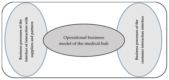 According to the presented structure (Figure 1), at the conceptual level, the business model of the medical hub consists of three key elements: the interface of interaction with suppliers and partners, the interface of interaction with customers (value proposition) and the operational model. Such a representation of the business model will make it possible to define critical points and strengths, as well as determine the framework for strategic management.