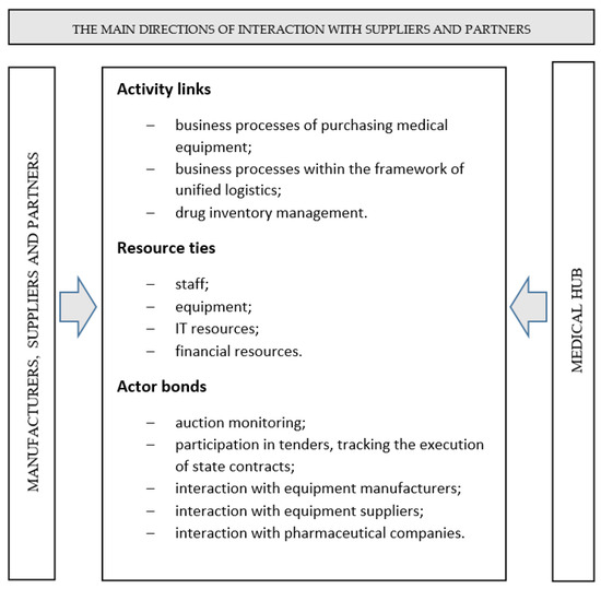 To be more specific, Activity links mean business processes for the purchase of medical equipment, business processes within a single logistical framework, inventory management of medicines, and project management. Resource ties represent all types of resources that take part in joint business processes. Actor bonds are contractual terms and personal relationships that develop between employees of medical organizations and suppliers.