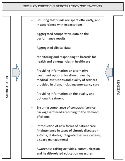 In addition to the interface for interaction with suppliers and partners, the key areas of interaction between participants of the medical hub and external clients should be considered. To optimize the interaction between all participants of the medical hub, as well as to increase patient satisfaction with the treatment process, it is necessary to complete the following tasks: ensure that patients’ rights are implemented; predict the potential effectiveness of medical services; control the dynamics of disease through follow-up contacts with patients; inform patients about the proposed methods and means of treatment, especially when using risk-associated methods; and develop preventive measures for pathological conditions. The main activities within the key areas of interaction between the participants of the medical hub and external clients are shown in Figure 3 below.