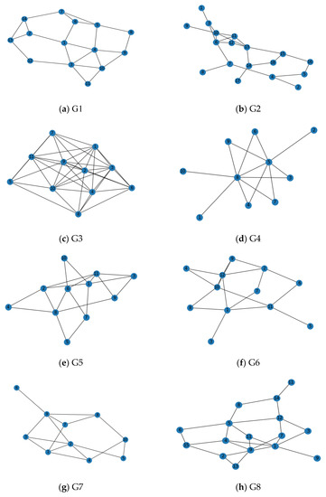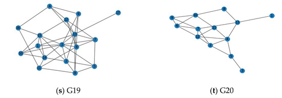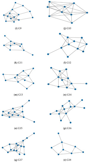 To build a social network, we will use only formal intra-project communications. Data collection of formal intra-project communications can be obtained through the use of automated project management information systems from the task tracker. To do this, a time interval is selected and information is collected on the intensity of interactions. A model of this kind of interaction within a team is a graph (network), where the number of vertices (nodes) corresponds to the number of project participants, and the edges are identified communications taking into account a given intensity. The model of the network of intra-project communications is presented in the form of an ordinary graph. Figure 7 shows 20 selected projects in the form of graphs G1–G20.