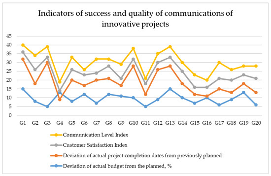 The customer satisfaction index was left unchanged, as it was calculated according to the corporate methodology. Customer satisfaction was measured at the completion of any project and is measured on a scale from 1 (lowest satisfaction) to 10 (highest satisfaction). In addition to project success indicators, the survey also provided group assessments of the quality of communications within each project. The level of communication is determined at the end of the project in the form of testing of project participants and is assessed on a scale from 1 (lowest) to 10 (highest). Indicators of success and quality of communications for each of the company’s studied projects are presented in Figure 8.