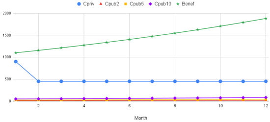 Furthermore, our model can extend the author’s evaluation to different scenarios. Considering the monthly average price for 2019, we can use Equations (1), (6), and (8) to evaluate the costs and benefits of the application for a year. Figure 2 shows the benefits (), the total monthly cost of a private network (), and the total monthly for a public network using 2, 5, and 10 gwei (, , , respectively), evaluated for the year 2019.