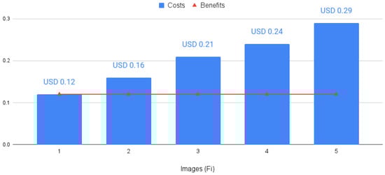 The authors use a cryptocurrency price of USD 187 and a gas price of 2 gwei to provide an average transaction price of USD 0.11. With our model, we can obtain the average transaction price by dividing the total costs Equation (2) by the number of actors Equation (3). This operation renders a value of USD 0.12, where the minimal difference is due to the estimation of the computation cost of interactions. Then, we extend the author’s evaluation by analyzing the impact of adding more images per user (changing the parameter ) impact the costs. Figure 3 shows this cost with a baseline of USD 0.12.