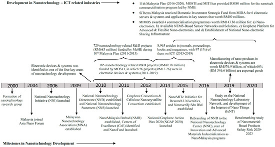 Figure 1 illustrates the chronology and milestones of nanotechnology development in Malaysia and highlights several main achievements in the sector of nanotechnology ICT-related industries (mainly the electronics devices and systems sector). Since 2010, extensive investments in the form of R&D grants have been made available by the Malaysian government to support both public and private sectors of nanotechnology R&D and commercialisation. In 2015–2020, SilTerra Malaysia, a Malaysian semiconductor wafer fabrication factory owned by Khazanah Nasional Berhad, which is the investment arm of the Malaysian government, received MYR 40 million from the Domestic Investment Strategic Fund from the Malaysian Investment Development Authority (MIDA) for the commercialisation of nanotech products. These investments contributed to an approximate 6% increase in SilTerra’s annual revenue, i.e., from MYR 24 million to MYR 36 million per year. Meanwhile, Malaysian Institute of Microelectronic Systems (MIMOS) has been awarded four commercialisation programmes amounting to MYR 143.86 million. The collaboration between MIMOS and NanoMalaysia Berhad (NMB) focuses on the commercialisation of the nanoelectronics market, especially those based on graphene, which will improve the electrical and electronics (E&E) industry in terms of high-complexity products and the creation of high-value jobs through the National Graphene Action Plan 2020 [29].