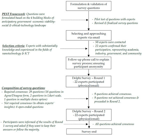 In this study, once the participants had agreed to participate in the survey, a follow-up phone call was arranged. During this process, a detailed overview of the survey was provided in terms of how the survey outcomes would be used as policy recommendations for the study. A total of 50 potential experts were approached in the process of the recruitment of survey participants. They were briefed on the survey process and the potential need for more rounds of surveys to establish a consensus of views. They were selected based on qualifications to apply their knowledge and experience [41,42,45]. The participants selected for this study were experts and defined as individuals who were substantially knowledgeable and experienced in the fields of nanotechnology and ICT. It must be noted that individually, expertise and knowledge in nanotechnology and ICT are significantly easy to acquire; i.e., there are many experts of each in field. However, identifying knowledgeable and experienced experts in ICT and nanotechnology was difficult since they had to possess a deep understanding and knowledge of ICT and nanotechnology and its cross-applications and linkages.