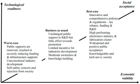 In this study, three possible situations were framed, which are hypothetical and relate to the utilisation of nanotechnology in the industrial sector, particularly in the ICT industry in Malaysia. These scenarios include an ideal situation, a scenario that is expected to continue without significant change and a scenario with the worst outcome. The technological preparedness, economic viability and social acceptability of each scenario were further discussed. These three potential outcomes are represented in Figure 5.