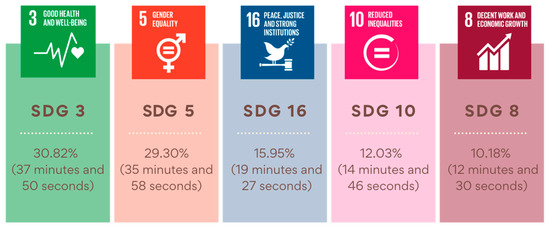 In addition, as will be explained in the “Results” section, in the group of “events” variables and in the spaces (within the group of “existings” variables), the timing was added transversally. Thus, it was possible to quantitatively analyze and compare the presence of themes aligned with the 2030 Agenda in the different stories and environments. From the sum of “events” related to an SDG, it was possible to measure the timing of each SDG in the series. It should be noted that an event can respond to several SDGs (for example, a situation of gender violence responds to SDGs 5 and 16). In these cases, it was decided to include these minutes in both.