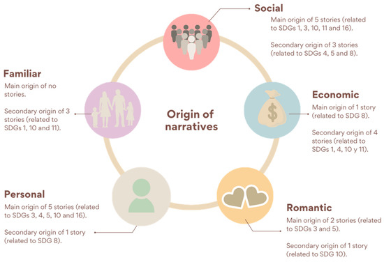 The environment in which the action takes place (whether it is public or private) acts as a variable in research related to issues of the 2030 Agenda such as violence [12] or gender equality; for issues such as the actions of women, they continue to develop only in a private space in fiction [28]. Therefore, two categories (public/private) were created to analyze the scope in which a narrative related to an SDG-related issue takes place (described in Appendix C, Table A3). In addition, the variable “type of space” was created based on the research of Fedele [18,84] to develop a content analysis on the representation of young people in teen series (explained in Appendix C, Table A4).