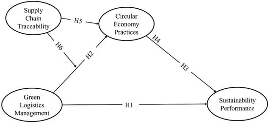 Extant studies on Green Logistics Management (GLM) have mainly emphasized GLM’s effect on ecological sustainability []. Nevertheless, a dearth of literature exists on how the GLM affects a firm’s sustainability performance (SP) through circular economy practices (CEP). Circular economy (CE) is a relatively new paradigm that maximizes the economic, environmental and social components of enterprises to convert the entire society into one that is more sustainable via the participation of all stakeholders involved. The circular economy (CE) concept is built on “the regenerative cycle, which facilitates the reuse of used products, parts, and materials efficiently, thereby increasing profitability and reducing environmental distraction” []. Several studies have documented the challenges and opportunities of adopting CEP in SMEs. Researchers have established CEP as a crucial predictor of SMEs’ sustainability performance [,,]. Literature has established that SMEs’ CEP ameliorates their sustainable-oriented innovation and subsequent SP [,,]. Recent research indicates that GLM can be regarded as an organizational component supporting the CEP []. Extant literature [] contended that the GLM is a necessary precondition and fundamental procedure for establishing a CE. Another stream of literature demonstrates the pivotal role of the GLM in ameliorating a firm’s sustainability performance. One group of scholars has corroborated the linkage between the GLM and the different dimensions of sustainability performance [,], while another group has reported the linkage between the GLM and a firm’s overall SP [,,]. Conversely, another area of research contends that the relationship between GLM and SP is not always direct [], creating contradictory findings in the literature. Some studies have unveiled a significant association between GLM and SP [,], while others have reported an insignificant association []. This inconclusive evidence compels us to study the function of CEP in the interaction between GLM and SP. As the GLM is a prerequisite for implementing the CEP, which in turn increases the sustainability performance of enterprises, we hypothesize that CEP successfully mediates the influence of GLM on SP. In addition, we posit that supply chain traceability (SCT) positively impacts the CEP of firms and acts as a moderator in the GLM-CEP association. Recent studies suggest that the exploitation of the SCT can be an essential catalyst for addressing supply chain disruptions and promoting green initiatives in the logistics system to help improve CE practices [,].