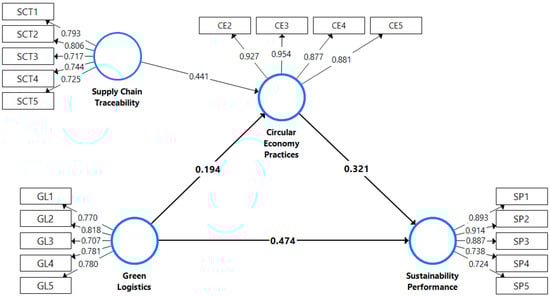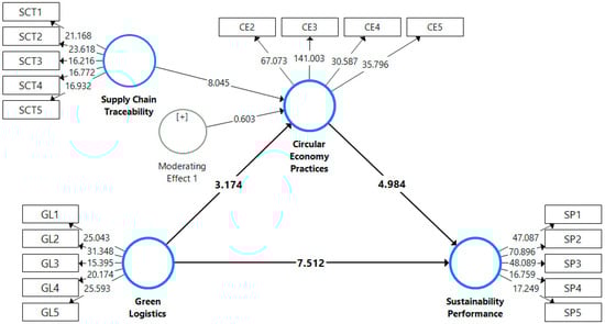 Table 6 reports both the direct and indirect effects of the model constructs. First, the GL positively impacted firms’ SP (β2 = 0.481, t = 7.512, p = 0.000), confirming hypothesis H1. Moreover, the GL strongly influenced firms’ circular economy practices (β1 = 0.195, t = 3.174, p = 0.000), supporting H2. CEP strongly linked positively with firms’ SP (β3 = 0.318, t = 4.984, p = 0.000), confirming H3. The mediation analysis revealed that the CEP strongly mediates the GL-SP link (β4 = 0.061, t = 2.837, p = 0.005), confirming H4. Furthermore, we found a positive effect of firms’ SCT on their CEP (β4 = 0.443, t = 8.045, p = 0.000), validating hypothesis H5. However, the findings depicted that the SCT had no substantial moderating effect on the association between the GL and CEP (β4 = −0.034, t = 0.603, p > 0.05), invalidating H6. Figure 3 represents the SEM of our analysis.