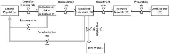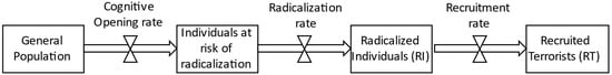 It is worth mentioning that the three models presented here represent only a portion of the studies on radicalization dynamics, with many other valid theories and models existing. The reasoning behind our selection is due to the fact that they constitute good “sequential/phase” representation models. In other words, they break radicalization down into a “step by step” process, providing an interpretation that is more schematic than other theories. Said interpretation lends itself to a translation into simulation models, as shall be seen in the next section. In particular, the existence of mutual relationships among various aspects at stake and the circular interdependencies that we have found call for the adoption of a systemic view through an inherently systemic modeling and simulation methodology, which is System Dynamics. However, this does not mean that the models chosen are the only ones suited to the task; future research may revisit the model presented in this paper in order to improve and/or enrich it through the adaptation and implementation of additional theories and phenomena, allowing for a more complete view of the issue studied. A non-exhaustive list of valid literature which may merit investigation and possible implementation in future developments includes: Moghaddam’s “Staircase” model of terrorism [] which involves a metaphorical staircase, where each step is influenced by a specific psychological process; the “Motivational imbalance theory” [] which argues that radicalization is founded upon the three pillars of needs, narratives and networks; “Identity fusion” [] which involves the union of the personal and social selves; McCauley and Moskalenko’s book “Friction” [], which divides radicalization into individual, group or mass radicalization. However, at present, the literature reviewed above is sufficient to construct a very first model that will serve the purpose of starting to investigate terrorism through a System Dynamics approach.