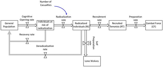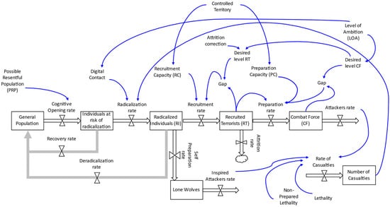 Thus far we have looked at two models for interpreting and clarifying terror attacks, and three for mapping out the radicalization process. The analysis of the first two models revealed that the degree of involvement a larger terror group such as Al Qaeda or ISIS has in a terror attack will have a significant effect on the lethality of said attack, with higher involvement causing far more damage. Then, through consideration of the three radicalization models, we have noted three common elements: “Cognitive Openings”, “Radical Ideology”, and “contact with other radicals or terror groups”. Stemming from the capacity of System Dynamics to highlight within complex systems a variety of elements useful to policy modeling [,,]. We will rely on such invaluable ability, aimed at creating policies that support curbing terrorism damages [], so to identify the systemic relationships among several elements in the overall system.