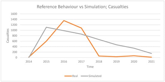 Before this baseline simulation, however, we must validate the model, that is verifying whether or not our model is descriptive of reality; in other words, we need to check that the simulated behavior (our outcome) is reflective of the actual past observed behavior over time, that is time-series of data that has been observed in the past. Our “real world” data will come from Europol’s yearly terrorism reports, which cover data starting from 2014. According to these reports, Islamic terror attacks produced roughly 3218 casualties from 2014 to 2021; given that the final output of our model is casualties, a time series comparison of the real-world data and the model prediction will serve well in checking whether the model is accurate. Said comparison may be found in Figure 7: