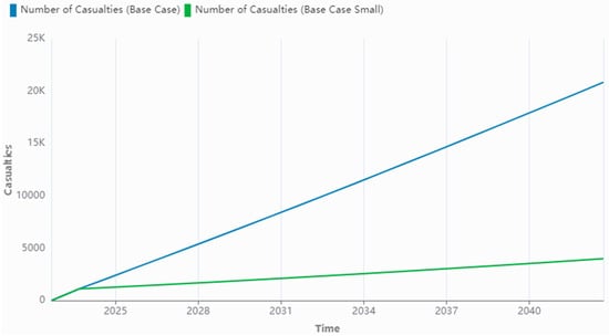 As regards the stocks of the model, as may be seen in Table 2, arbitrary initial values have been assumed for all in order to “imagine” that the process described is not starting from scratch but ongoing. The only exceptions are the general population, which has been set in order to mirror the current EU population and fixed, so as to assume full refilling of the stock as it is drained by the mode, and the number of casualties, which has no initial value.