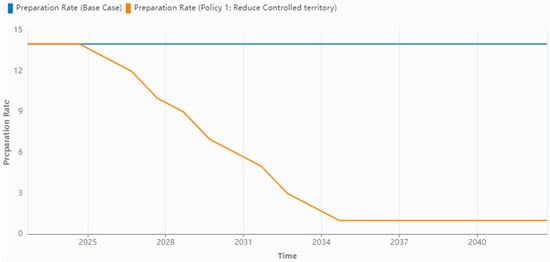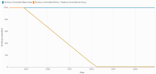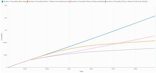 Running the simulation yields a total of 4572 casualties over eight years, with a trend over the timespan analyzed following that observed in the real-world data. The key element in this first simulation has been the controlled territory variable. Indeed, while Europol provides data regarding the casualties produced, other sources document that ISIS, the main perpetrator of the attacks which occurred in the studied timeframe, went from having 100,000 km2 of territory in 2014, to just 4000 km2 in 2019 []. As such, setting our model to mimic this behavior, as may be seen in Table 3, has allowed us to verify that a change in a variable in reality, when transposed into the model, will cause the outcomes to mirror each other, meaning we can assert with sufficient confidence that our model is descriptive of reality. Furthermore, the identification of the link between casualties and territory would have been interesting in of itself, however the model allows us to formalize and quantify this relationship, clarifying that it is not a direct linear link between the two, but rather the effect that territory has on terror group’s capacity to recruit and train terrorists that will then determine their capacity to cause damage. The identification, quantification, and verification of this link (and as a consequence, the model itself) allows us to proceed in using the model as a tool to search for leverage points in which policy intervention would be ideal.