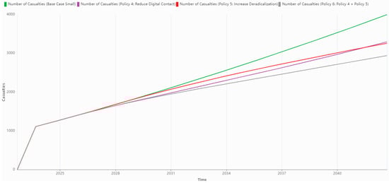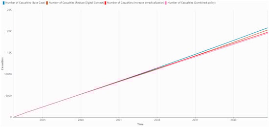 Lone wolves, as we have highlighted, are the modus operandi of “modern” terror groups. Lone wolves are a strategy that take advantage of the asymmetry between supply and demand, but in a different way. Instead of highly training a few, terror groups seek to keep the stock of radicalized individuals high so that they will produce more lone wolf attackers over time. As such, the main policy goal we must pursue is that of reducing the stock of radicalized individuals, consequently lowering the casualties. Once again, various courses of action were tested, with the most promising being highlighted in Table 8, Table 9 and Table 10 and Figure 14.