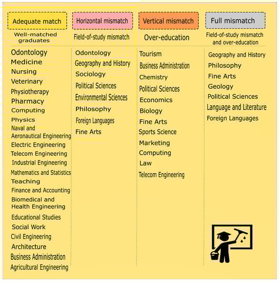 - Salas-Velasco, M. Mapping the (mis)match of university degrees in the graduate labor market. J. Labour Mark. Res. 2021, 55, 14. [Google Scholar] [CrossRef]