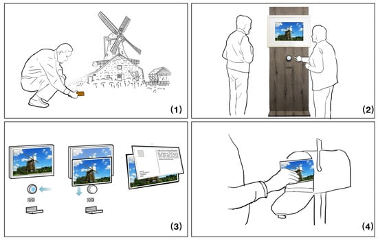 The Interactive Gallery system comprises two main components: scenery-collectors and a gallery-like interactive installation. Scenery-collectors are distributed to volunteers from local communities to share real-time scenery photos with senior residents. The gallery-like interactive installation is situated in the public space of the nursing home and allows senior residents to view and print scenery photos into postcards by simply pressing a button. These postcards can be used to communicate with the sharers or be shared with others. Additionally, the Interactive Gallery can also provide topics for the residents to communicate with each other. A use scenario of the Interactive Gallery system is presented in Figure 2: (1) The proposed system involves the distribution of scenery-collectors to citizens in local communities, which they can place wherever they choose to share scenic views with nursing home residents. The scenery-collectors are equipped with automatic cameras that capture the views at pre-determined intervals and transmit them to a gallery-like installation in the nursing home. (2) This installation displays the scenery photos and the addresses transferred from the scenery-collectors. (3) Senior residents can print photos as postcards by pressing a button on the installation. If the scenery photo reminds them of memories and experiences related to the photos, they could write them on the back of the postcards. (4) The postcards can be either exchanged with the senior residents or sent to the citizens who shared the view.