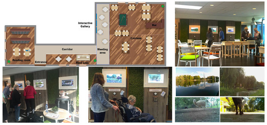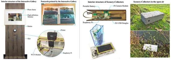 The distribution of scenery-collectors to volunteers is a crucial aspect of the system as it enables the real-time sharing of local scenery with senior residents. The gallery-like interactive installation allows the residents to experience the scenery photos in a tangible and interactive way, which enhances their engagement with the content. A tangible user interface (TUI) is a user interface in which a person interacts with digital information through the physical environment []. The purpose of a tangible interface is to empower collaboration, learning, and design by giving physical forms to digital information, thus taking advantage of the human ability to grasp and manipulate physical objects and materials. By printing the photos into postcards, the system also facilitates communication between senior residents and the outside world. The provision of topics for communication could potentially reduce social isolation and loneliness among the residents. Figure 3 illustrates the practical application of the Interactive Gallery system, which can be replicated in other nursing homes or care facilities to improve the well-being of senior residents.