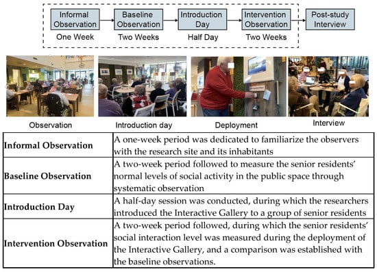 The observation was carried out by two trained observers, namely the first and the third authors, with the aim of studying the behavior changes in senior residents due to the deployment of the Interactive Gallery system. The field study consisted of three rounds of observation, namely informal observation, baseline observation, and intervention observation, as illustrated in Figure 4. The observers used a standardized protocol to record the participants’ behaviors.
