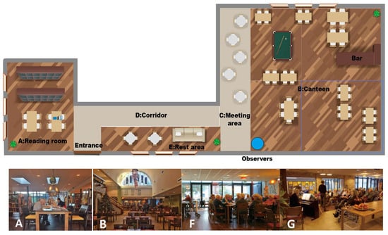 The average age of the senior residents in our selected nursing home was approximately 85 years old. Approximately twenty residents who suffered from dementia were not included in the study. The public space on the ground floor of the nursing home included a meeting area, a library, and a restaurant/café, which were open to all. Among these areas, the restaurant/café and meeting space were the most frequently occupied by senior residents. As such, we selected these two locations as the research sites, as shown in Figure 5.