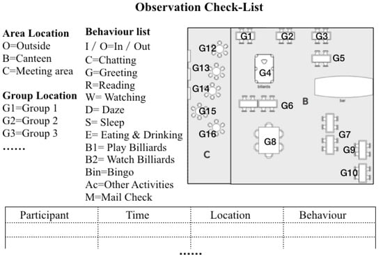 Observation of senior residents in Areas B and C (the canteen and meeting area, respectively) was conducted by two observers for a duration of two hours each day, excluding activity days in the nursing home. To minimize observer bias, unobtrusive observation techniques were employed, with observers sitting inconspicuously in corners of the public areas and refraining from interacting with the senior residents. The aim of this method was to make the act of observation and recording unnoticeable to those being observed []. Senior residents were free to engage in their usual activities without any disruption.