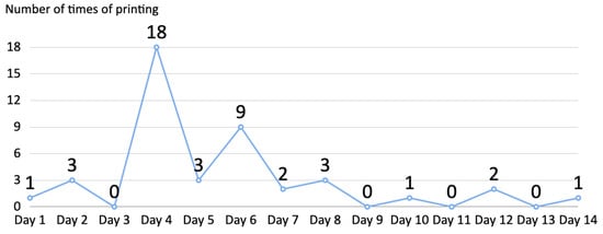 The frequency of postcard printing per day (from 1:00 PM to 3:00 PM) during the observation period of the intervention.