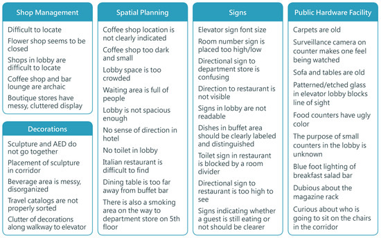 A summary of problems based on the observations and feelings recorded when we experienced the services at the hotel was completed. The problems were then categorized to sum up the types of problems encountered and the dimensions to which they belong. Closely related groups were examined in detail and classified to show their relationships. The touchpoints in the CJP were organized into two main areas of the hotel. One is the public space with five categories of pain points: shop management, decorations, spatial planning, signs, and public facility (Figure 3). The other is the intermediary space and hotel rooms with another five categories of pain points: feelings about the environment, services, feelings about theme, room facility, and use (Figure 4).