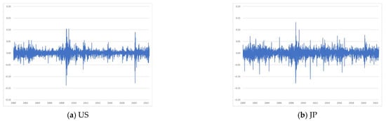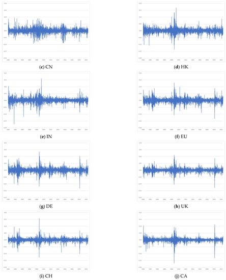 To discover international stock market risk connectedness, we analyzed the daily closing prices of 10 stock markets: the United States (US, S&P500), Japan (JP, Nikkei 225), China (CN, Shanghai Composite Index), Hong Kong (HK, HANG SENG Index), India (IN, BSE Sensex), the European Union (EU, EURO STOXX 50), Germany (DE, DAX), the United Kingdom (UK, FTSE 100), Switzerland (CH, Swiss Stock Market Index), and Canada (CA, S&P/TSX Composite Index). We selected stock exchanges with high market capitalization, focusing on Europe, Asia, and North America. The sample consisted of 10 stock markets operating between 5 January 2000, and 30 July 2022, with 4579 observations. Daily returns are calculated as the logarithmic difference between two consecutive daily prices. All data were obtained from Infomax (https://news.einfomax.co.kr, accessed on 5 August 2022).
