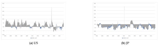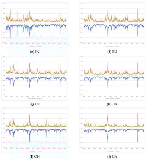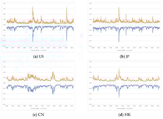 Using the GJR-GARCH (1,1) model, we measured the downside and upside risks associated with all the stock markets. Figure 2 shows the upside and downside VaRs of the 10 international stock markets. Based on the figures, changes in VaR estimates for downside and upside risks were basically similar, though the range of fluctuations in the upside VaR (absolute value) was higher than the downside VaR. Additionally, the downside and upside VaRs underwent significant fluctuations during the initial phases of the GFC and the COVID-19 pandemic. Unlike the other two events, all countries experienced significant fluctuations during the GFC. However, during the COVID-19 outbreak, while there were significant fluctuations in the Americas and Europe regions, CN, HK, and JP experienced relatively small fluctuations. In particular, JP experienced significant fluctuations during the GFC. Moreover, CN showed great fluctuations between 2015 and 2016 because of the stock market bubble and the decline in the economic growth rate. Furthermore, the rapid changes that occurred in 2002 and 2004 were driven by factors such as economic openness, increased foreign investment, and political instability.