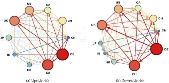 Figure 3 displays the estimation results of the net pairwise directional connectedness within the international stock market network. The size of a circle (or node) indicates the level of connectedness. If the circle’s color is red, it denotes that the stock market is a risk transmitter; if it is blue, it implies that the stock market is a risk receiver. The arrow (or link) indicates the direction of risk connectedness, whereas the thickness of the arrows indicates the intensity of the net pairwise connectedness. For upside risks, the net connectedness of DE is the largest, followed by the EU and the UK. Thus, the European stock market is the network’s major market for pairwise risk connectedness. However, CN and IN have been shown to act as risk receivers. Figure 3b illustrates that the net risk connectedness of the stock market remains unchanged even at downside risks. The intensity of net pairwise connectedness from developed economies (DE, the EU, and the UK) to other countries appears similar in both upside and downside risk networks.
