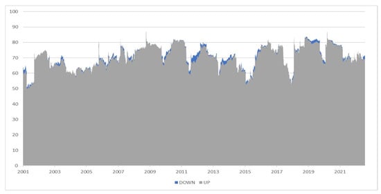 Recently, a few studies investigated the connectedness between tail risks [,]. A previous study analyzed the connectedness of downside risks, whereas empirical analysis of upside risks is scarce. Upside risks, similar to downside risks, are another type of systemic financial risk as they can lead to future losses and high uncertainties []. In addition, market participants’ ability to respond to market changes because of different information is bound to vary depending on upside and downside risks. Thus, analyzing and comparing upside and downside extreme risks together is useful in stabilizing the stock market network and helping investors’ risk management strategies. In this context, it is worth investigating the connectedness of upside and downside risks between international stock markets.