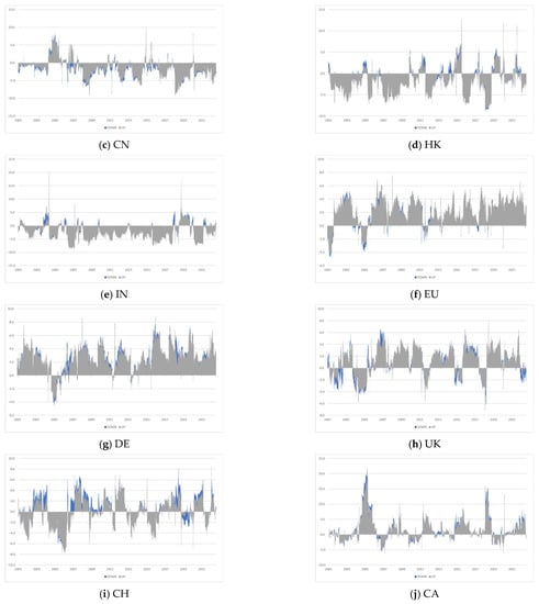 To better understand the time-varying movements of connectedness, we investigated net connectedness, revealing information about the direction of connectedness for the 10 stock markets. A positive value refers to a transmitter of risk to other stock markets; negative values are the opposite. Figure 5 shows the net dynamic connectedness between international stock markets for upside and downside risks. The plot distinguishes between upside and downside risks using gray and blue, respectively. We observed that all stock markets showed significant time-varying patterns; however, they were found to have a greater magnitude on the stock market in the case of downside risks. Our results show ample evidence of asymmetric connectedness. Each stock market shows this pattern because it is event-driven or affected by the way it responds to crises, economic characteristics, and geographical proximity. Although the net connectedness of all stock markets fluctuates between positive and negative values in response to specific events, overall, the US, the EU, DE, and the UK are the net transmitters and JP, CN, HK, and IN the net receivers of upside and downside risks. These results indicate that the European stock markets are less affected by spillover effects from other stock markets and confirm that the German stock market has the greatest influence on other stock markets. This finding aligns with the results of Youssef [] and Zhang [,]. Thus, the developed stock markets continued to be net transmitters of risk during the sample periods, except for CH and CA, whereas Asian stock markets were net receivers. Although the importance of Asian stock markets has been growing recently, their influence on developed countries is relatively weak and has not increased significantly over time.