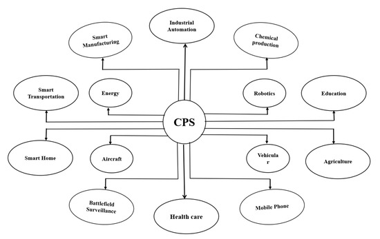 CPS-based technologies are in the primary stage [49]. Therefore, in Industry 4.0, the application of CPS is continually changing and expanding. Many CPS-based applications have been developed or implemented in a wide range of industries, such as aircraft transportation systems [50], battlefield surveillance [51], chemical production [52], energy [53], agriculture (food supply) [54], healthcare [55], education [56], industrial automation [57], manufacturing [58], mobile devices [59], robotics [60], transportation [61], and vehicular [62]. Researchers and practitioners may have to reach a compromise among their aims to create a combination of benefits and cost, based on desired CPS and Industry 4.0. The discussed fields are graphically shown in Figure 1.