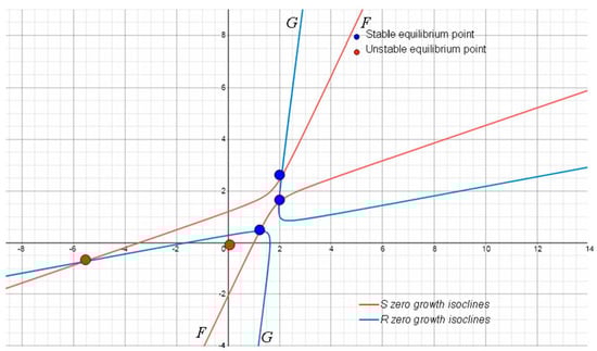 Graph of F and G showing three positive solutions and one negative equilibrium point.