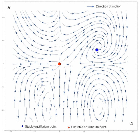 By solving (15), we obtain and . The coexistence equilibrium point could have three different dynamical behaviors depending on sign and value. Traveling curves when approaching the steady state equilibrium will an exhibit inward spiral motion in case (stable) and an outward motion if (unstable). Trajectories will orbit around the steady state equilibrium in uniform motion for (neutrally stable). The practical interpretation of this dynamical behavior would be when and coexist on a given social media platform, and there are interactions occurring when online users read, comment, repost, react, etc.; these interactions will have different outputs depending on key parameters and many other factors related to the information’s proximity to the interacting individual’s biases, interests, awareness, educational background, etc. The coexistence of and could last longer or not, one of the interacting entities will dominate and occupy more space in the community’s mind or mobilize more attention in ongoing related discussions, or they could both thrive and appear periodically in conversations for a relative period. It would be interesting to investigate the determinants driving people to be attracted to or with respect to when and for what reason, but these are out of the scope of this investigation.
