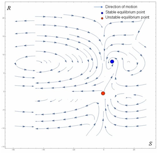 Figure 6 displays the case where is clearly overpowered even if it possesses a relatively greater (double) per capita grow rate α = 1.88 compared to β = 0.79 for . The steady state equilibrium is asymptotically stable, and all trajectories orbit around this point of the positive quadrant of the phase plane. In this situation, the trending rumor invades the platform, has the strongest presence, and receives the most attention when reposting, commenting, and so on. To avoid this undesirable outcome, one could optimize the social bots’ online activities to drive more comments or reposts by using, for instance, the capacity of this powerful tool to create multiple automatic accounts and generate larger numbers of virtual followers very rapidly; this will also boost its assimilation efficiency in ecological terms (or positive feedback in strengthening online presence). Here, a2/a3 is relatively greater than b1/b2. We derive from this result that via artificial intelligence, high-credibility or authoritative information with scientific support or proofs can be efficiently pushed toward social media users for increasing knowledge and rising awareness to say the least. In addition, all combined effort and technology would without a doubt help restore public trust in mainstream media and build more healthier and democratic social environments.