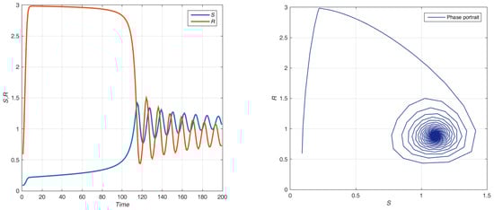 S and R interaction dynamic time series and phase space for the following: S(0) = 0.8; R(0) = 0.04; α = 1.6; a1 = 0.51; a2 = 0.032; a3 = 0.023; b1 = 0.197; β = 2.18; b2 = 0.0329; and N = 7.